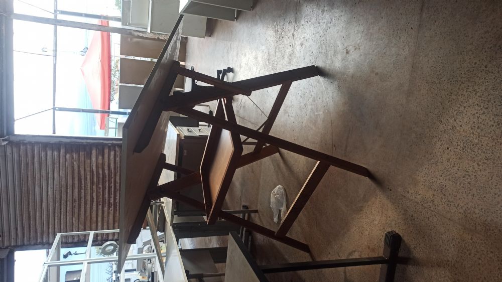 Mesa de desenho técnico com estrutura em madeira e tampo ajustável.